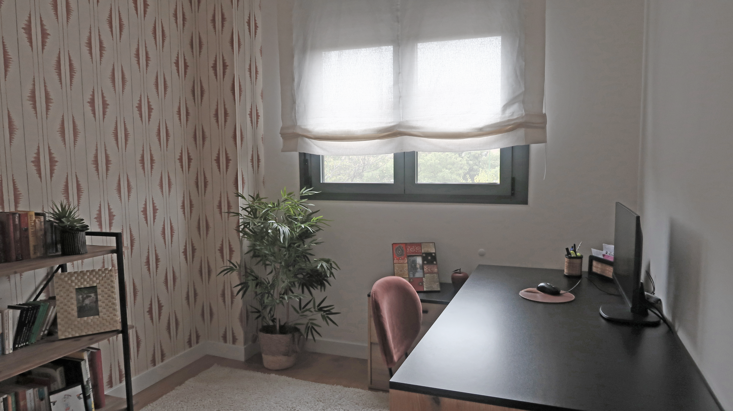 y la repetición del motivo generan una atmósfera equilibrada, perfecta para un espacio de trabajo acogedor y creativo.