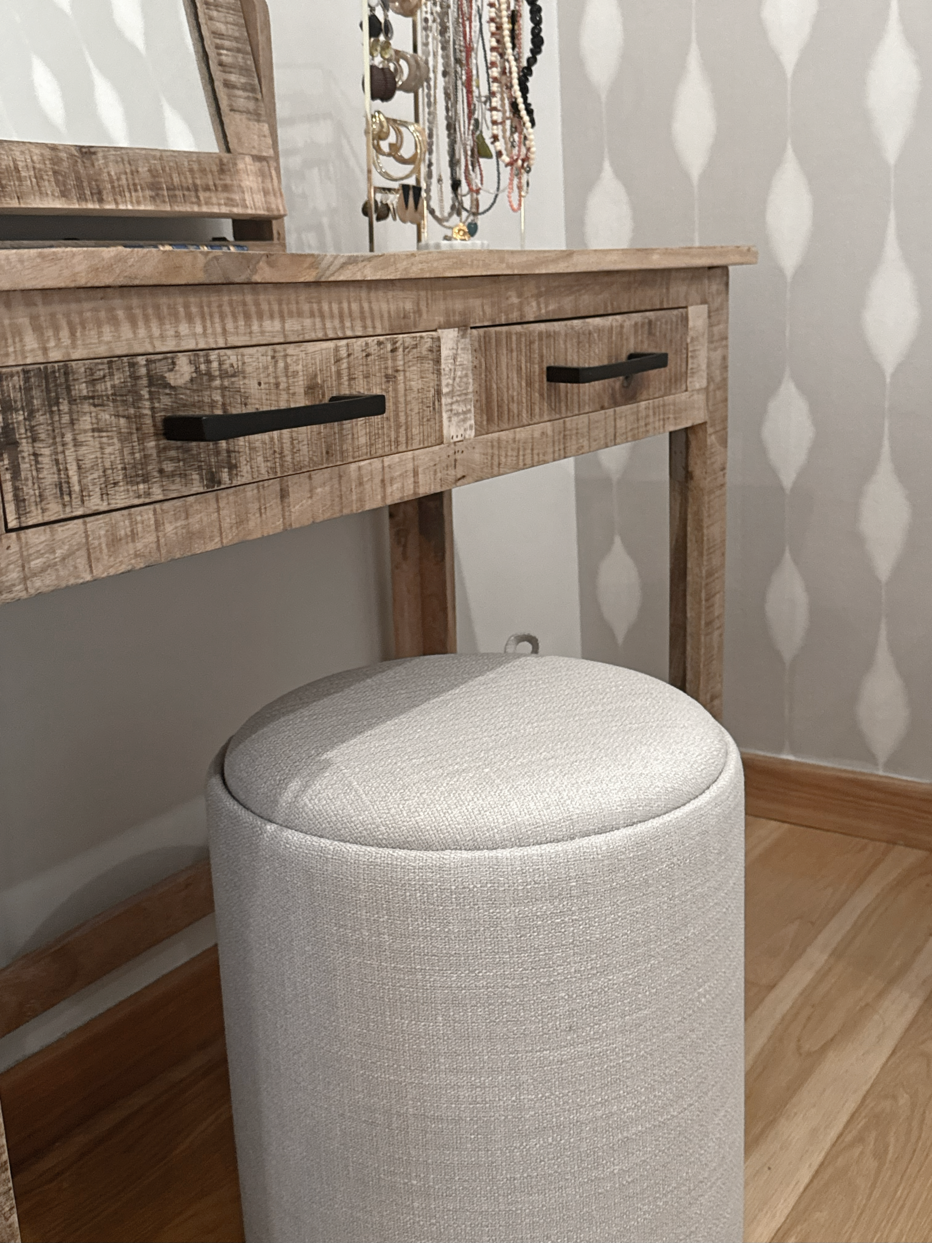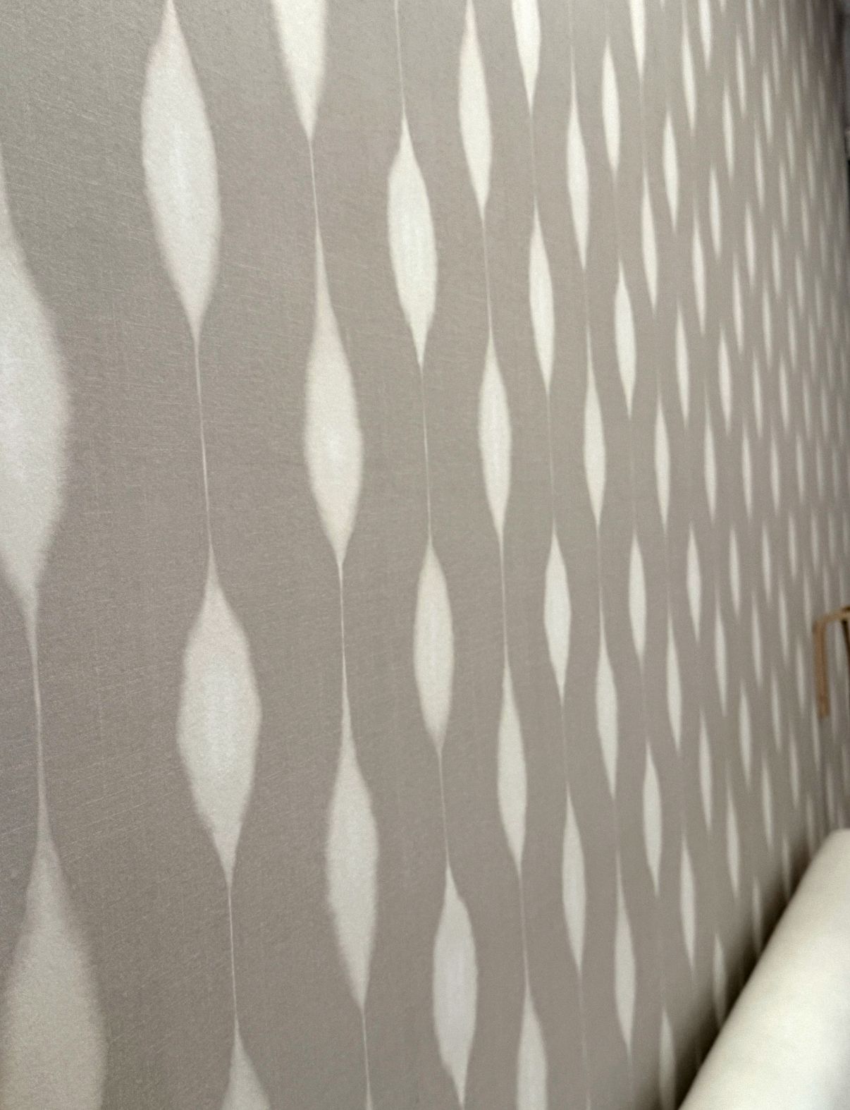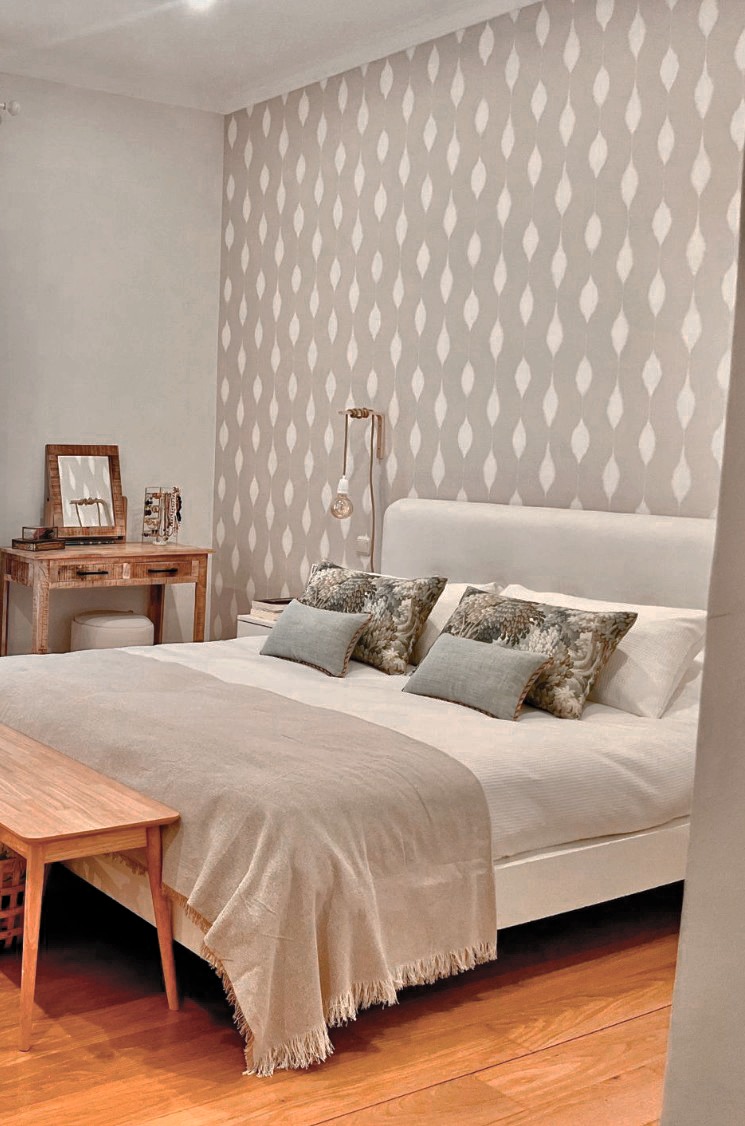 Para completar el conjunto, elegimos un papel pintado de motivos orgánicos que aporta movimiento y carácter sin restar tranquilidad al espacio.