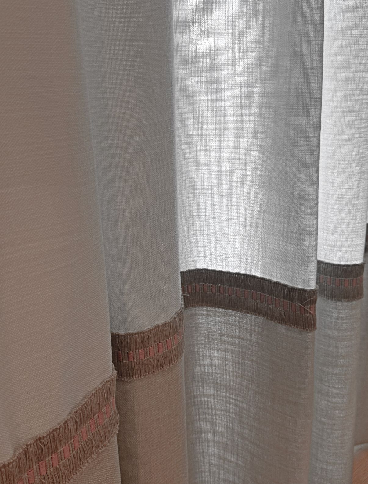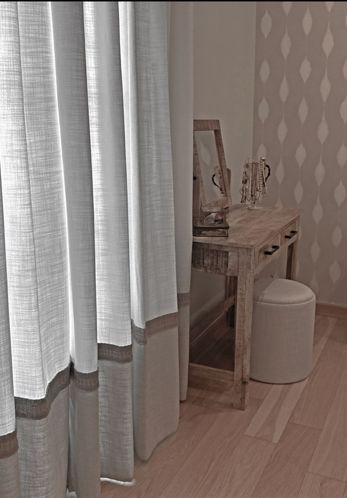 Las cortinas, confeccionadas a medida, combinan transparencias y tonos tierra que tamizan la luz de forma delicada, generando una sensación envolvente y serena.