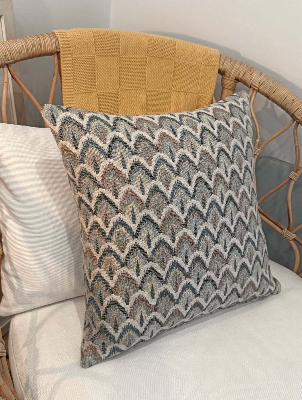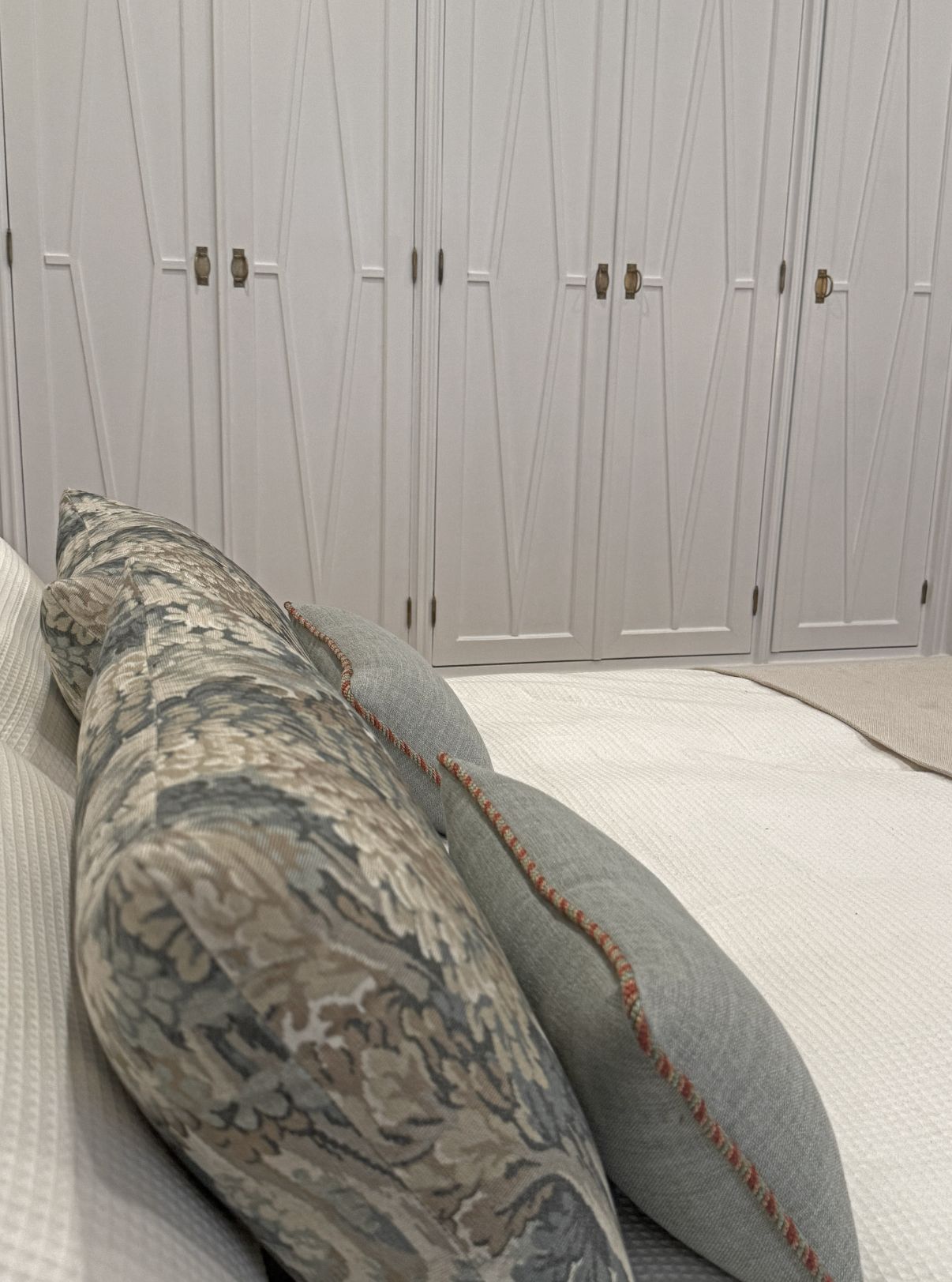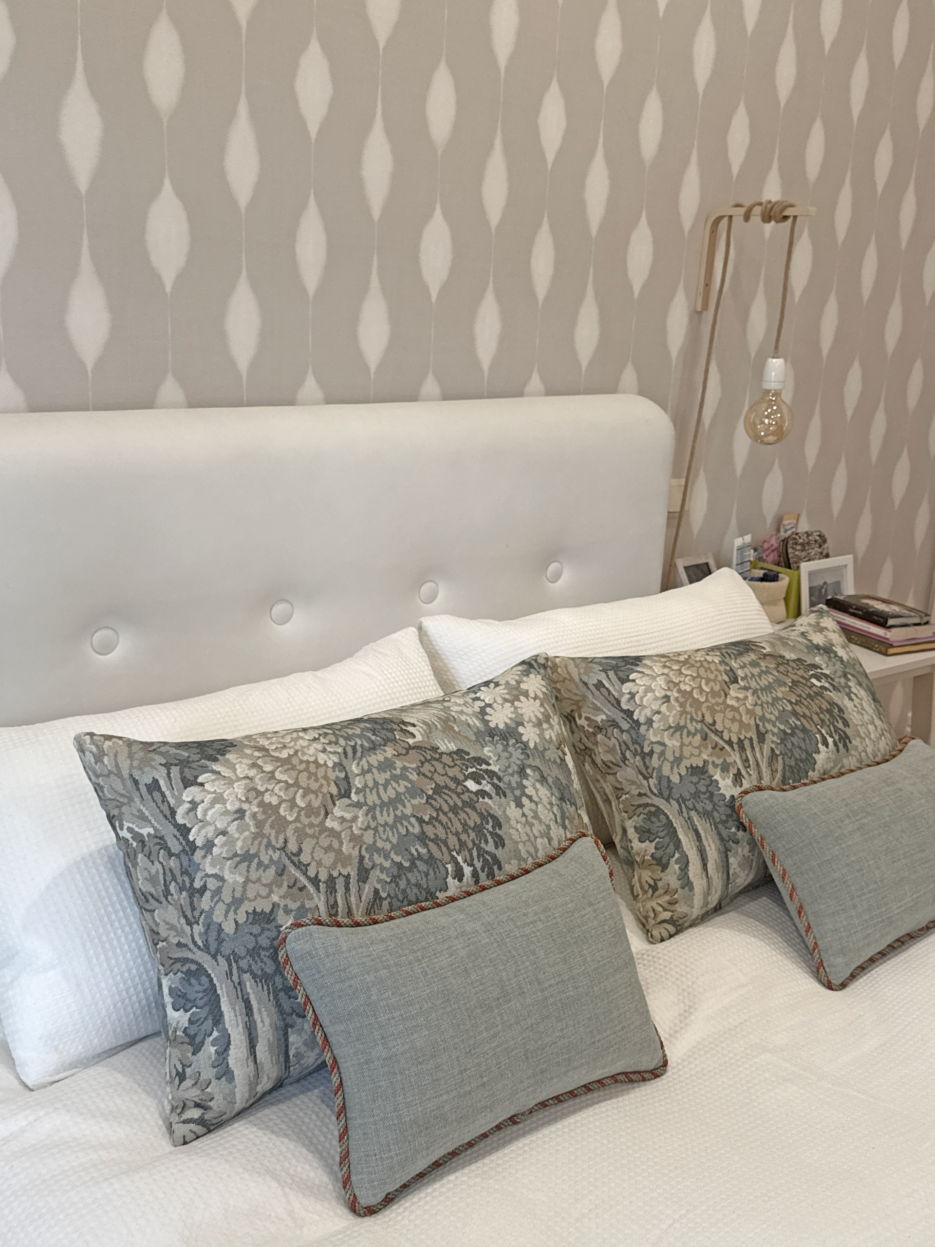 Diseñamos los cojines de la cama y de la butaca seleccionando tejidos con textura y una paleta suave que conecta con la naturaleza, aportando profundidad y armonía visual.
