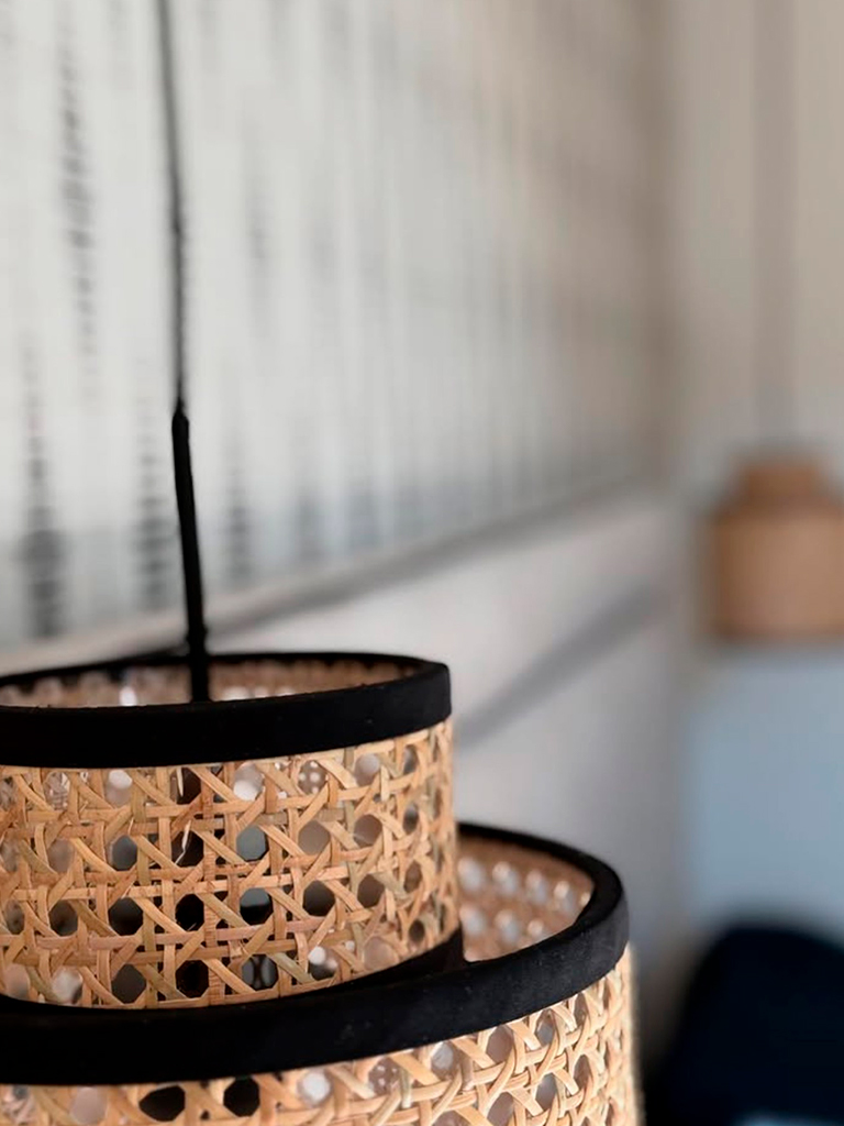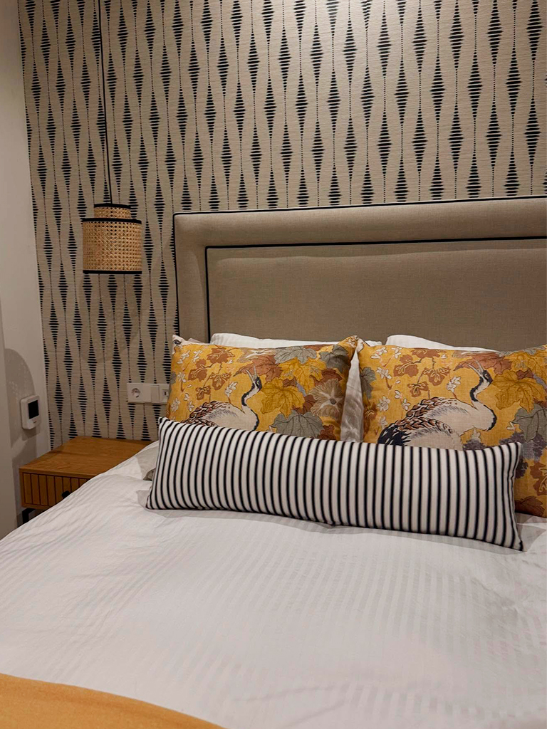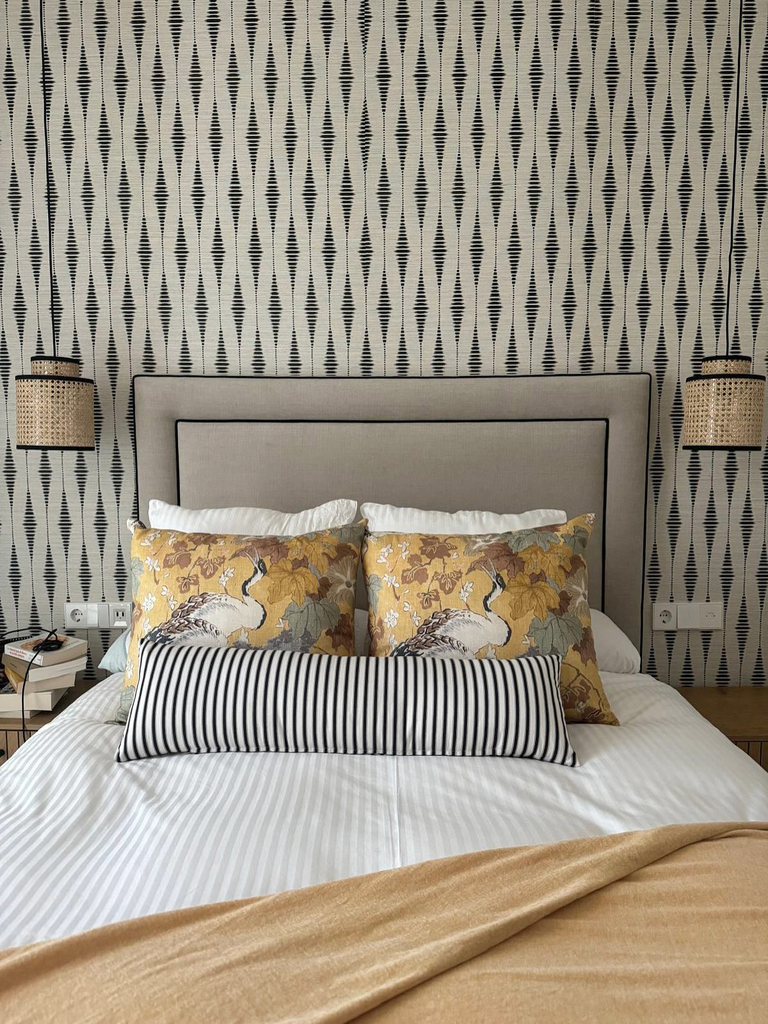 El punto de partida es un papel pintado texturizado con un patrón geométrico en tonos neutros y negros, que añade profundidad y dinamismo a las paredes. Para equilibrar la composición, hemos incorporado lámparas suspendidas de rafia, aportando un toque natural y envolvente que suaviza el conjunto.