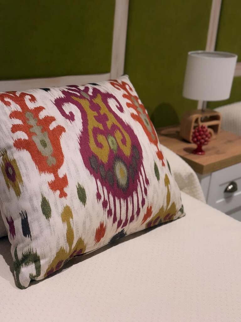 Para esta intervención, añadimos cojines con estampado ikat en vibrantes tonos fucsia, verdes y ocres, creando un contraste dinámico y lleno de energía. La combinación perfecta para un espacio juvenil que transmite frescura y vitalidad.